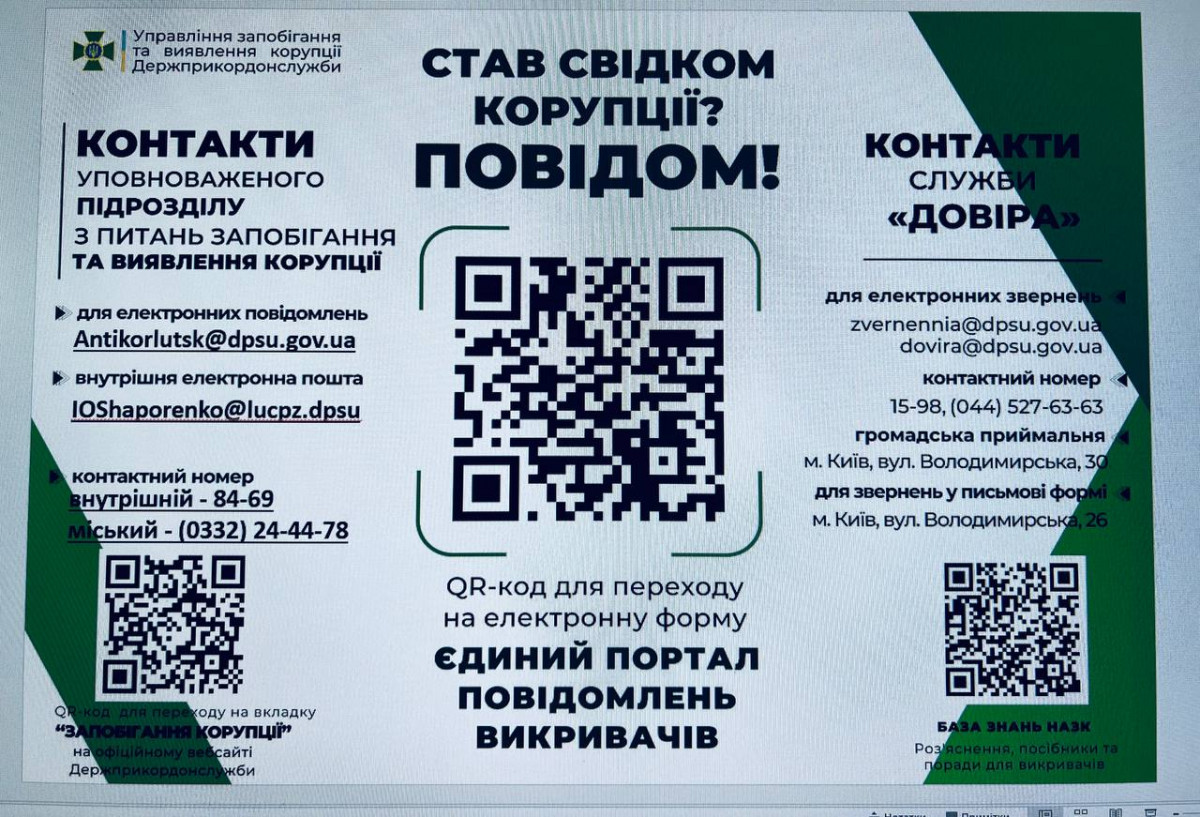 Якщо ви стали свідками протиправних дій з боку співробітників ДПСУ, ви можете звертатись до уповноваженого підрозділу з питань запобігання корупції за номером: (0332) 24-44-78.