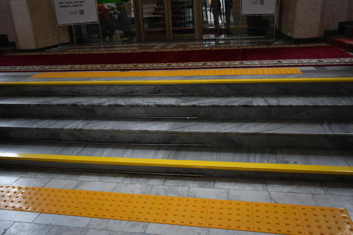 Також у будівлі провели низку робіт: нанесене контрастне маркування жовтим кольором, у ліфтах з’явилися таблички зі шрифтом Брайля, мінімізовані пороги вхідних дверей, перед входом та сходами облаштовано тактильну плитку з рельєфними елементами для орієнтування людей із порушеннями зору.
