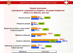 У наступному році буде продовжено практику надання місцевим бюджетам додаткової дотації на здійснення переданих з державного бюджету видатків з утримання закладів освіти та охорони здоров’я. Разом з тим, загальний обсяг такої дотації для області на наступний рік складає лише 317,4 млн грн, що на 259,5 млн грн, або майже на половину менше ніж у цьому році (на 2019 рік передбачено 576,9 млн гривень).