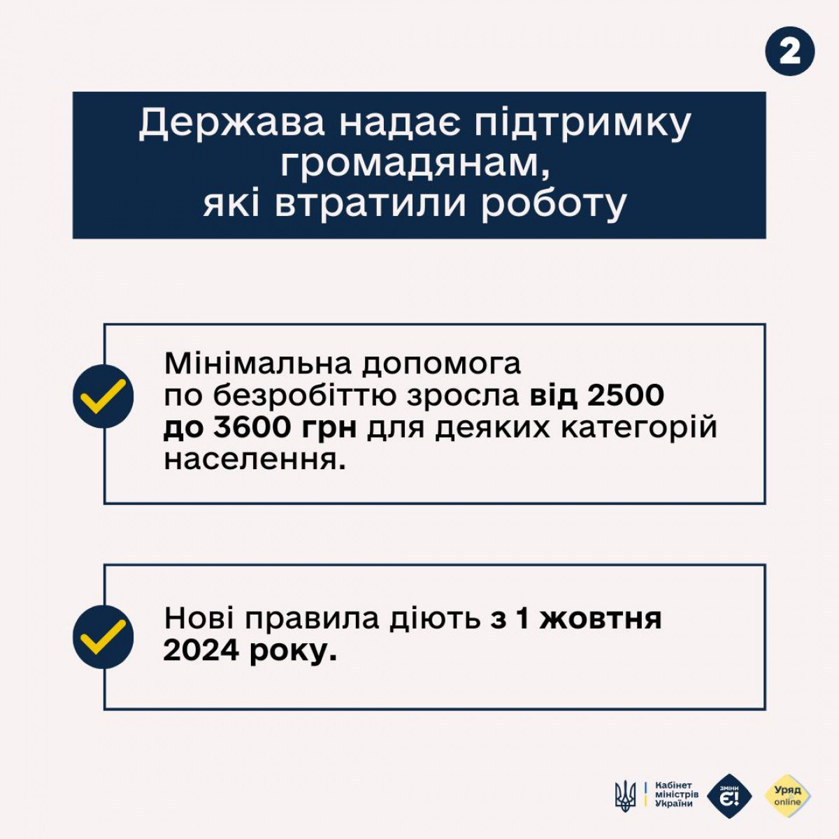 Зокрема, з 1 жовтня 2024 року діють нові правила, а мінімальна допомога по безробіттю зросла від 2500 до 3600 грн для деяких категорій.