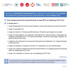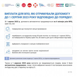 Зокрема, Уряд визначив, що для всіх ВПО, які зараз отримують допомогу, з 1 серпня 2023 року буде автоматично продовжено виплату ще на пів року, тобто до кінця січня 2024 року. Виплати будуть здійснюватися 15 та 28 числа кожного місяця та становитимуть: