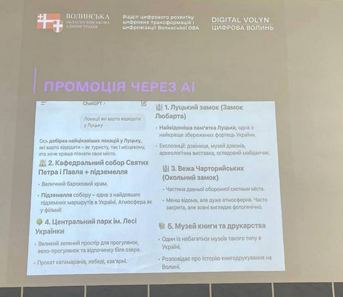 👉Промоція через штучний інтелект – Вікторія Левчук також представила можливості АІ-просування туристичних локацій, як один із перспективних інструментів маркетингу для бізнесу та своєрідний планер для подорожей.