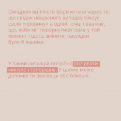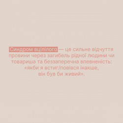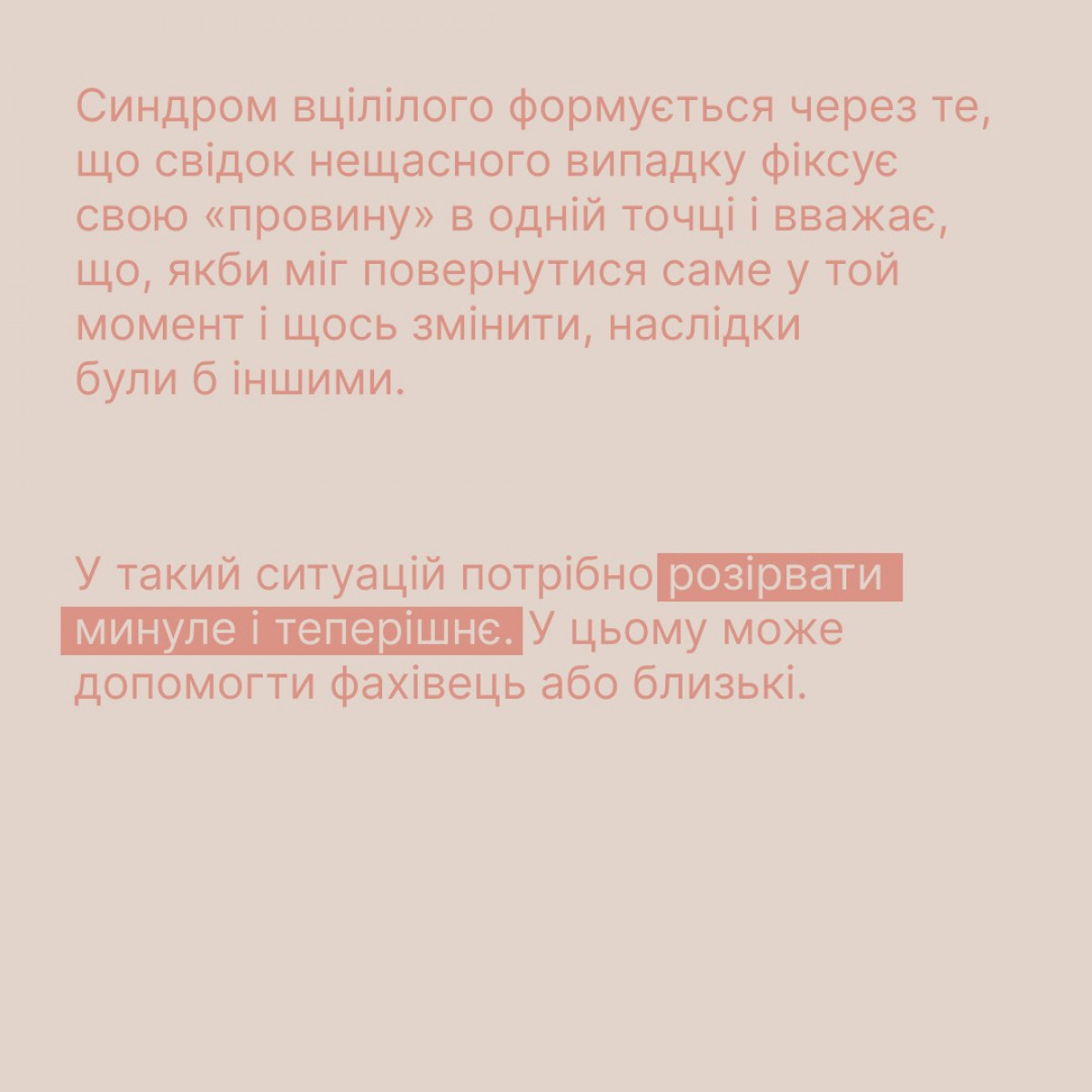 Коли людина втрачає когось із близьких або ж опиняється у ситуації, яка загрожує життю, і стає свідком смерті інших, у неї може сформуватися синдром вцілілого. Вона знецінює власний негативний досвід, відчуває сором та провину, позаяк вважає, що не доклала зусиль, аби врятувати життя.