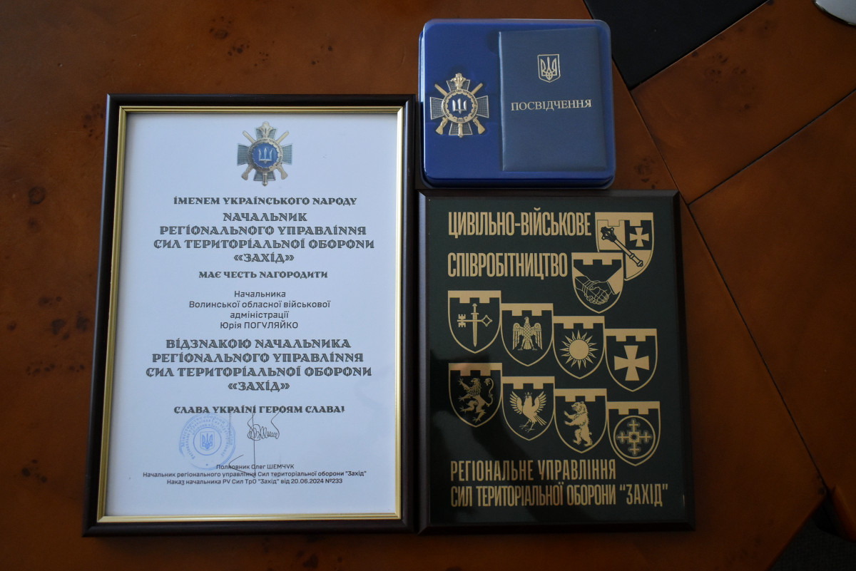 Начальник ОВА Юрій Погуляйко отримав відзнаку від регіонального управління Сил ТрО «Захід» за допомогу обласної адміністрації у формуванні й забезпеченні бригад тероборони.