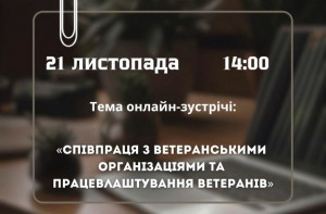 21 листопада 2024 року о 14:00 відбудеться онлайн-зустріч керівництва області з підприємцями на тему: «Співпраця з ветеранськими організаціями та працевлаштування ветеранів».
