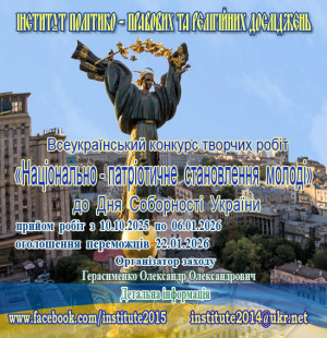 Інститут політико-правових та релігійних досліджень з нагоди відзначення Дня Соборності України проводить Всеукраїнський конкурс творчих робіт «Національно-патріотичне становлення молоді».