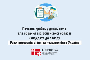З метою обрання від Волинської області кандидата до складу Ради ветеранів війни за незалежність України (далі - Рада), відповідно до Положення про Раду, затвердженого наказом Міністерства у справах ветеранів України від 29 січня 2026 року № 90 (далі - Положення), обласна військова адміністрація оголошує про прийом документів кандидатів до складу Ради.