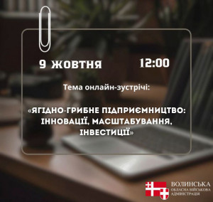 9 жовтня 2025 року о 12:00 відбудеться чергове онлайн-засідання в межах платформи «Діалог влади та бізнесу». Під час зустрічі обговорять сучасні тенденції та інновації у ягідно-грибному бізнесі, можливості масштабування підприємств від малого фермерського господарства до регіональних виробників, інвестиційні перспективи та шляхи залучення фінансування для розвитку бізнесу.
